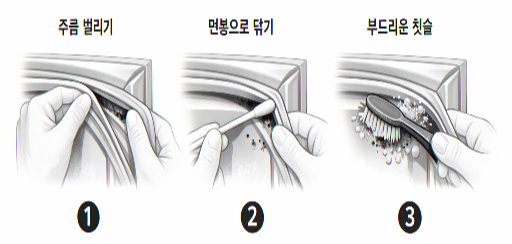 - 패킹 주름을 손으로 벌려, 면봉/부드러운 칫솔로 홈 안쪽의 검은 때·가루·곰팡이 흔적을 제거합니다.