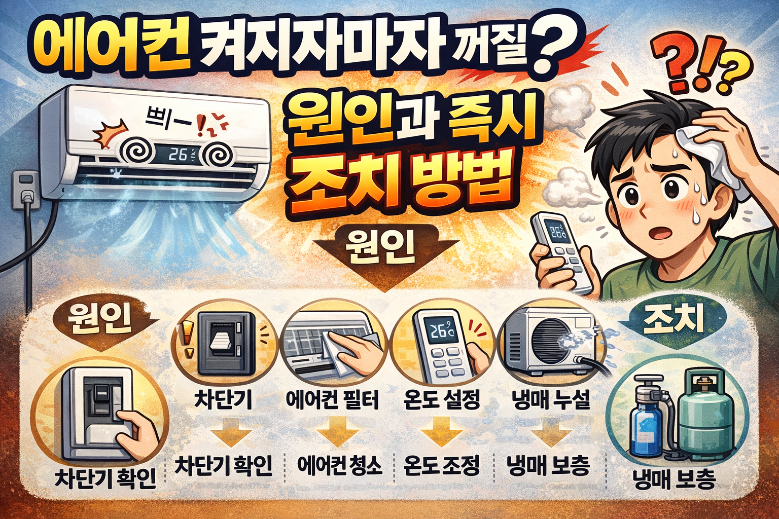 에어컨이 켜졌다가 바로 꺼지는 현상은 고장보다 보호 기능 작동일 확률이 높습니다.